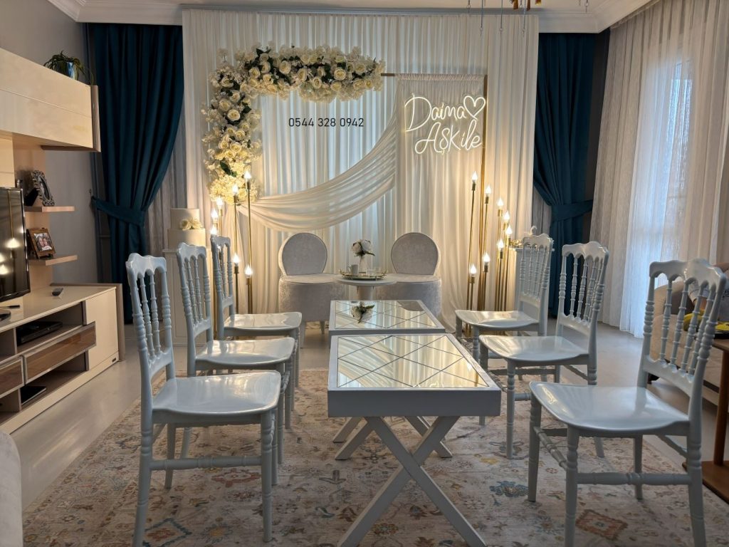 Geçiş kelimeleriyle ifade etmek gerekirse, “bununla birlikte” misafirlerin oturma düzeni de en az dekorasyon kadar önemlidir. Öte yandan, nişan masasının konumu kapı girişinden uzak, fonun (background) en iyi görüneceği noktada olmalıdır. Bizim ekibimiz, kurulum öncesinde evinize gelerek veya fotoğraf üzerinden analiz yaparak en uygun köşeyi belirlemektedir.